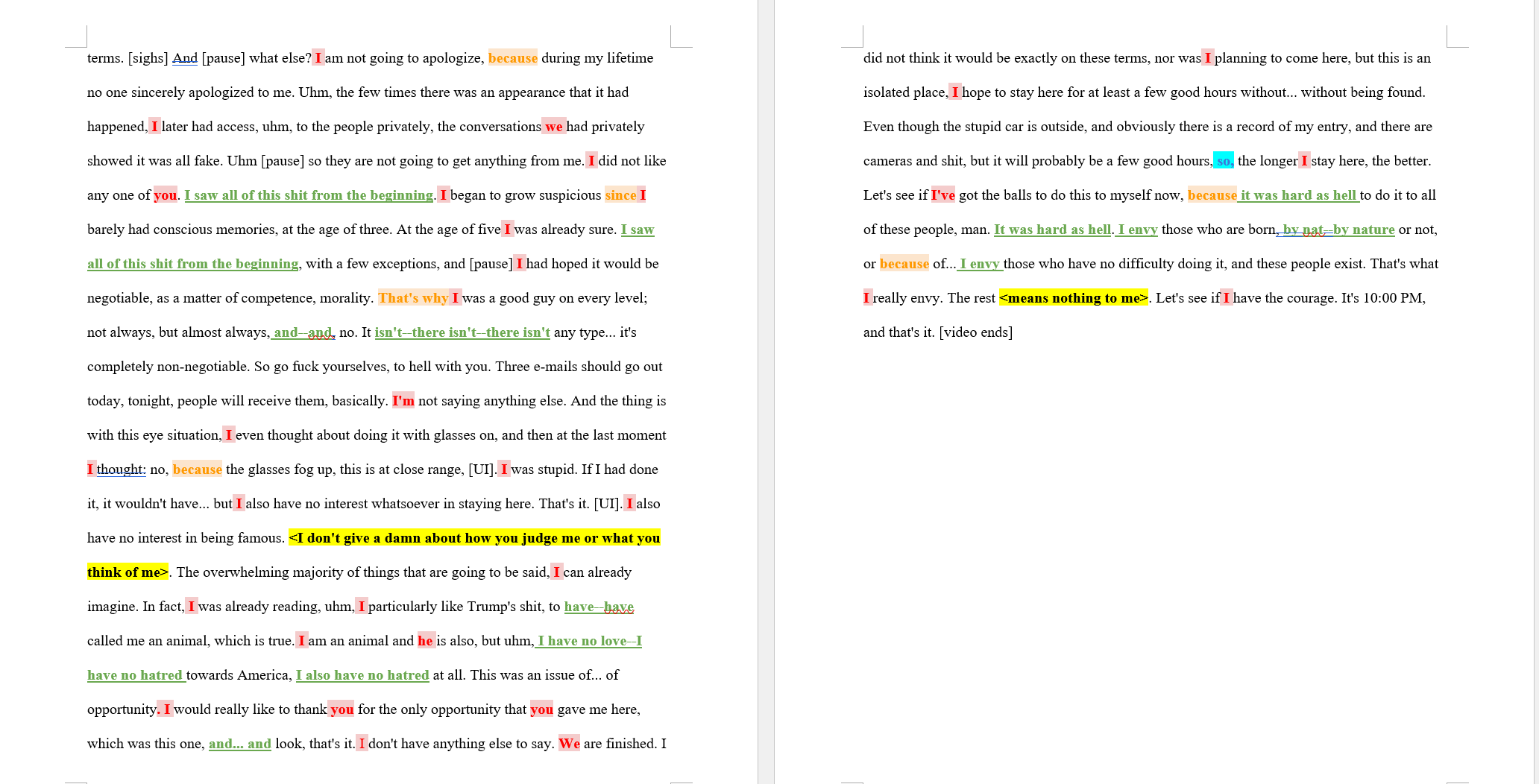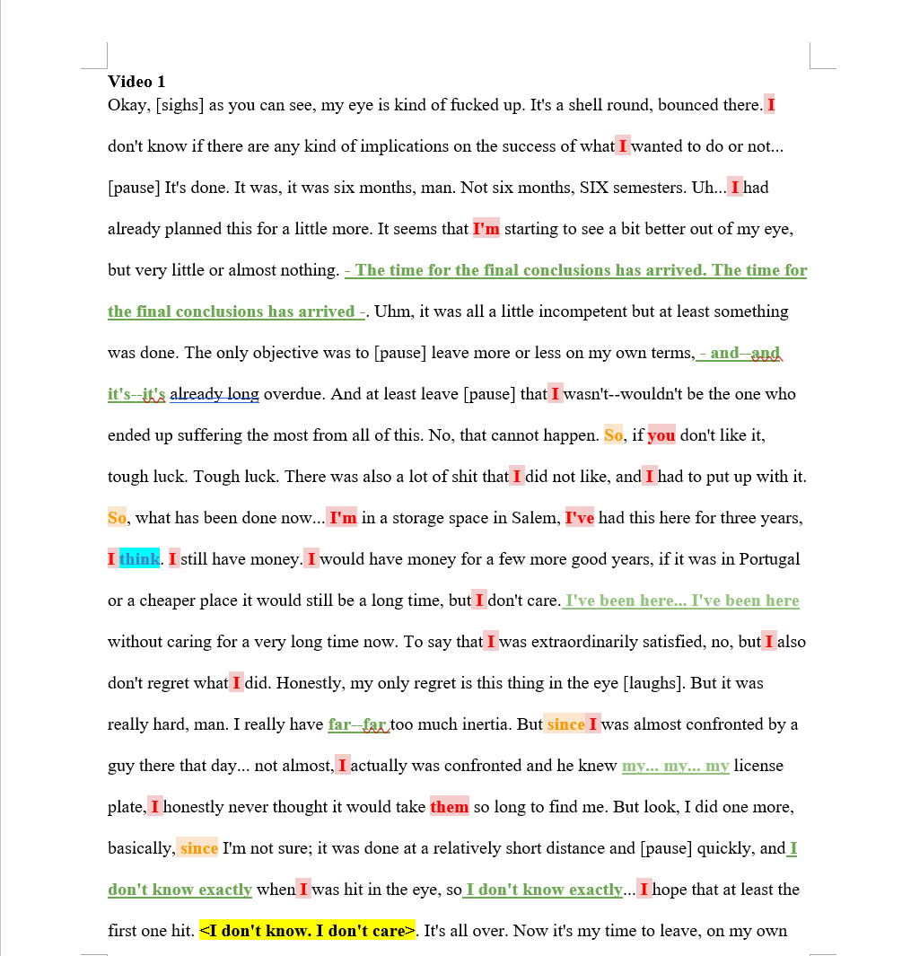 The entire narrative has an extremely high frequency of “I,” which demonstrates ownership and narrative control. This shows the agency of the speaker, whereas in assessments of courtroom testimonies, there tends to be a lack of “I” when the speaker is feeling guilt and wants to create distance between themselves and the scene.