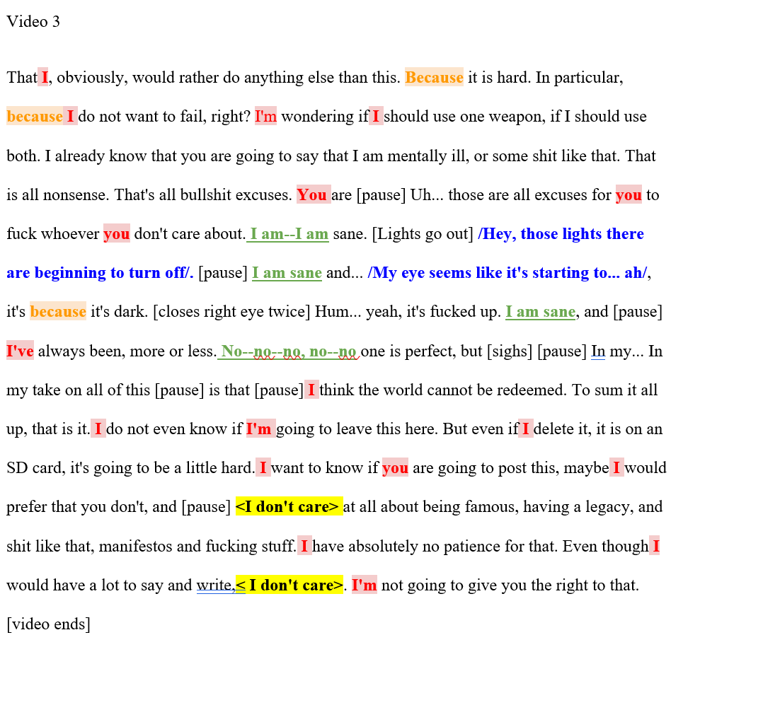 His videos function as a suicide note, and the content, especially when we consider their chronology, does not entail a confessional revelation nor a manifesto. It resonates a narrative constructed for the audience, correcting rumors and clarifying his lack of feeling. The chronology of his videos shows how much he prioritized how his audience would perceive him. His first video encompasses a defensive narrative establishing his lack of remorse, his intention of “leaving on his own terms”, and the vague explanation as to why he was led to commit such acts. It is in the second video that he begins to touch on what he said in his previous video, adding more resentment toward others. His third video enforces that he is a reliable narrator, repeating that he is sane, and as if to prove that he is not an ego-driven maniac, declares that he does not want to leave a legacy or manifesto and “does not care” what others think (which is ironic). His final video is prompted by his need to correct rumors claiming that he said “Allah Akbar” during the attacks. What mattered most to Valente before his death was control of his narrative.