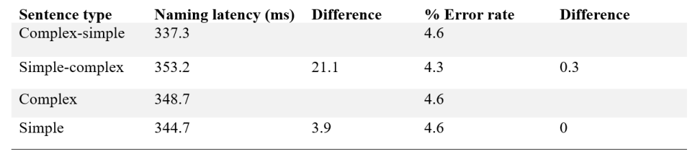 In Figure 1, the comparisons of length and complexity are shown. As stated before, though there was a slower mean onset latency for complex sentences, there were no significant differences in onset latencies for simple and complex sentences, illustrating no effect of sentence length (one-clause and two-clause), which does not successfully replicate previous findings.