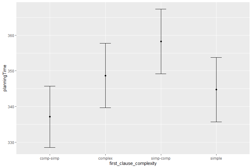 First-clause complexity demonstrates a main effect, more closely shown in Figure 2. Contrary to previous studies on English-speaking humans, simple first clauses elicited slower onset latencies than complex first clauses. Interestingly, the one-clause and two-clause sentences testing for length are also slower than the three-clause complex-simple phrases. Though this difference is not significant, it is notable that there is an apparent strategic change in sentence planning for changes in sentence length.